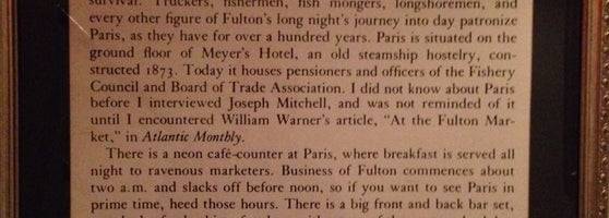It may not be the salty fishermen's haunt that it once was but it still a classy yet low key bar and restaurant. Order the Paris Seafood Chowder, it's loaded with scallops, shrimp, and mussels.